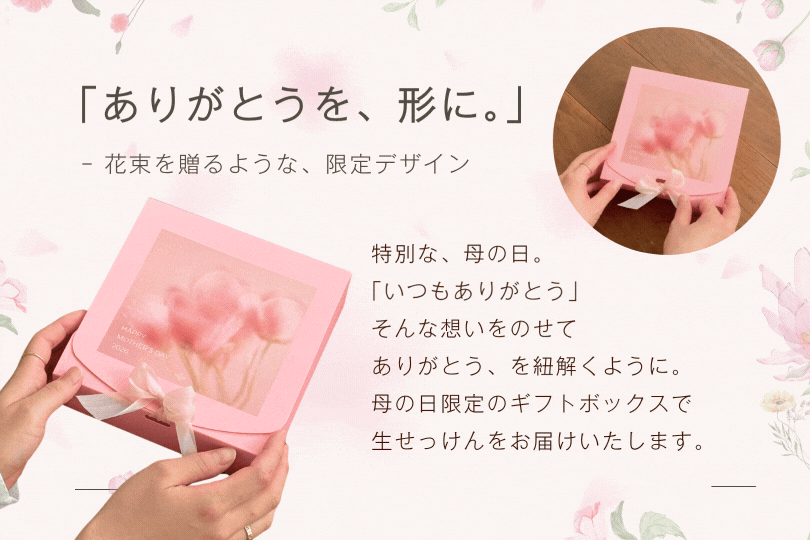 母の日の特別な贈りものとして。やさしいピンクのギフトボックスに包んでお届けします。「ありがとう」の想いをのせて、花々をあしらったボックスは、まるで花束を手渡すような、やわらかな華やかさ。開けるその瞬間まで、心ほどけるひとときを。母の日の贈りものとして、そのままお渡しいただける仕様でお届けします。