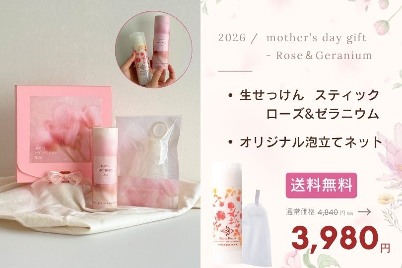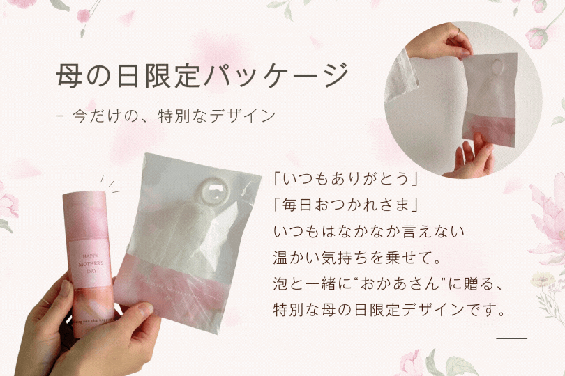 いつもの生せっけんとは少し違う、母の日だけの特別な装い。ギフトボックスを開けたあとも、花束を受け取ったような華やかさが続くように。生せっけんは、母の日限定デザインのスリーブ(紙筒)で。泡立てネットも、同じく特別仕様のパッケージでお届けします。