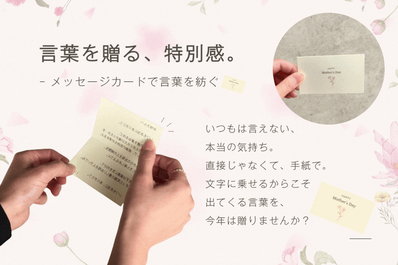 「いつもありがとう。」少し照れくさくて、いつの間にか言えなくなっていた言葉。母の日という、特別な日だからこそ。胸の奥にしまっていた想いを、カードにのせて届けてみませんか?ご指定のメッセージを印字し、ギフトと一緒にお届けします。メッセージに関してのご指定がなかった場合は「印字のない」カードをお届けいたします。(→詳しくは各セット商品ページをご確認ください。)