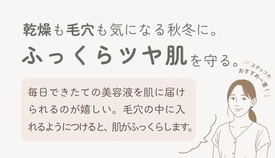 美容液と美容オイル‥軽くふって混ぜ合わせるたびに、できたての美容液が完成。フレッシュなうるおいが肌のなかまでスッとなじみ、乾きがちな秋冬の肌をやさしく包み込みます。使うたび、肌がうるおいを思い出すような、心地よい一滴を届けます。