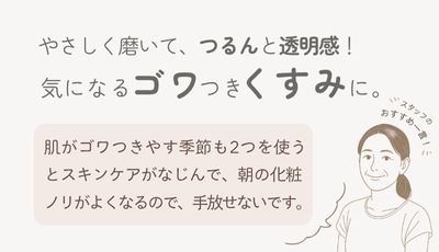秋冬の冷たい空気で、毛穴にたまった皮脂やごわつきも冷えてしまいがち。スクラブ洗顔ジェルは、炭の力で黒ずみや角栓にアプローチしながらも 素肌 にうるおいを残して肌をやわらげます。こんにゃく由来のスクラブなので、素肌を傷つけずに毎日お使いいただけるのも嬉しいポイント。