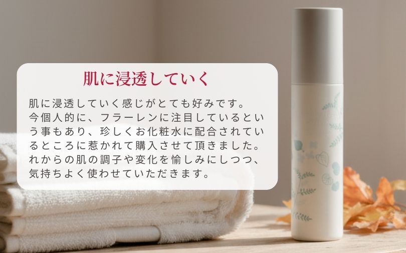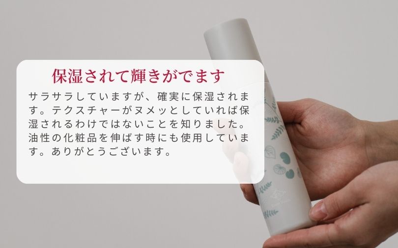 合成界面活性剤・鉱物油・パラベンなどは不使用で、必要な成分だけを厳選。やさしさと心地よさ、どちらも妥協せずに追求した化粧水です。