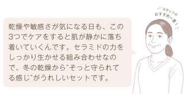 乾燥や敏感さを感じやすい冬の素肌に、静かな安心感をもたらす3ステップです。