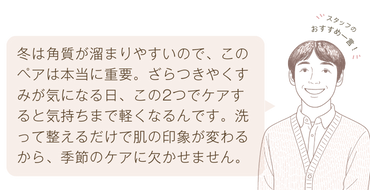 乾燥が続く冬は、肌の水分が不足するだけでなく、角質が硬くなり、ざらつきやくすみを感じやすい季節。そんな“滞りがちな冬の肌”に、そっと息を通すような素肌に整えるセットです。